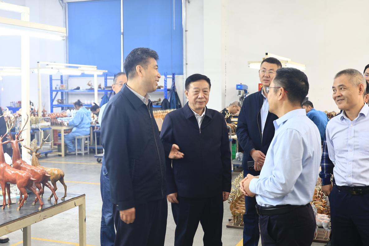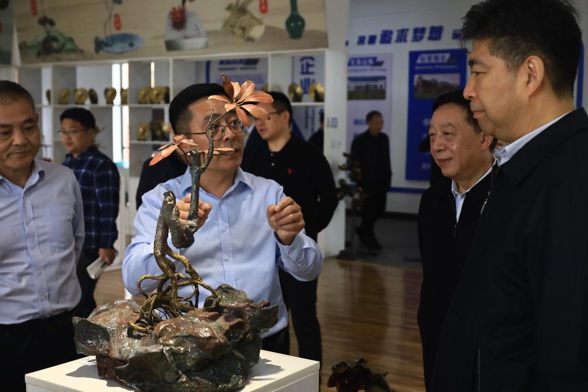 公司負(fù)責(zé)人郭飛陪同參觀并匯報(bào)了企業(yè)生產(chǎn)經(jīng)營(yíng)、市場(chǎng)銷(xiāo)售、非遺技藝傳承等情況。調(diào)研組深入車(chē)間詳細(xì)了解銅工藝品制作技藝、工藝傳承創(chuàng)新,曲福田副主任對(duì)我公司把傳統(tǒng)工藝和現(xiàn)代創(chuàng)意有機(jī)結(jié)合做法給予充分肯定,并就優(yōu)化產(chǎn)品結(jié)構(gòu)、提升產(chǎn)品競(jìng)爭(zhēng)力與公司負(fù)責(zé)人進(jìn)行交流探討,他希望銅官府進(jìn)一步強(qiáng)化品牌培育,用匠心延續(xù)銅工藝的“金”字招牌。